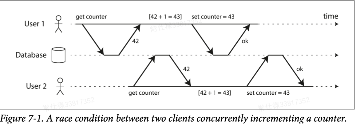 这里给一个具体的实例来直观感受下,如下图展示了两个客户端并发的修改DB中的一个counter,由于User2的get counter发生的时刻在User1更新的过程中,因此读到的counter是个旧值,同样User2更新也类似,所以最后应该预期counter值为44,结果两个人看到的counter都是43(类似两个线程同时做value++)。