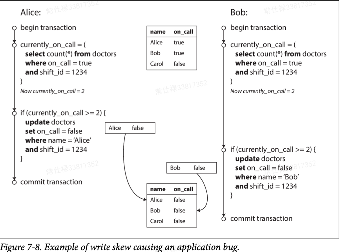 实例中有两个人Alice和Bob决定是否可以休班,做这个决定的前提是判断当前是否有两个以上的医生正在值班,如果是则自己可以安全的休班,然后修改值班医生信息。但由于使用了快照隔离(后面会介绍)机制,两个事务返回的结果全都是2,进入了修改阶段,但最终的结果其实是违背了两名医生值班的前提。