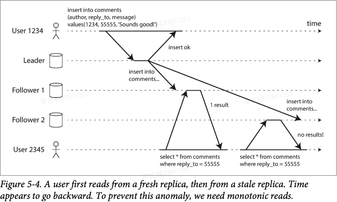 上面是用户更新后查看的例子,下一张图则展示了另一种情况。用户同样是在系统中写入了一条评论,该模块依旧采用了纯异步复制的方法实现,此时有另一位用户来看,首先刷新页面时看到了User1234的评论,但下一次刷新,则这条评论又消失了,好像时钟出现了回拨,如果系统能够保证不会让这种情况出现,说明系统实现了"单调读"一致性(比如腾讯体育的比分和详情页)。