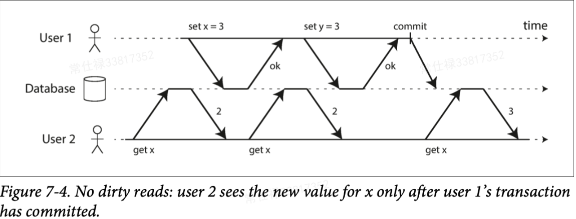 所谓脏读,指的就是用户能不能看到一个还没有提交事务的结果,如果是,就是脏读。下图展示了没有脏读应该满足什么样的承诺,User1的一个事务分别设置x=3、y=3,但在这个事务提交之前,User2在调用get x时,需要返回2,因为此时User1并没有提交事务。