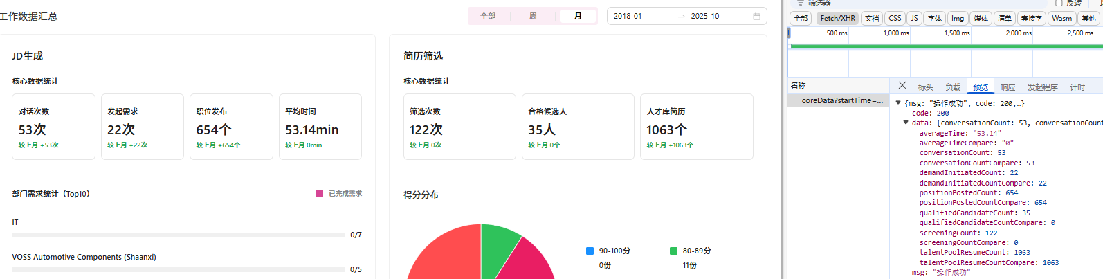 该功能用于数据统计卡片的 "同比 / 环比比较展示",适配 "对话次数、发起需求、职位发布、平均时间、筛选次数、合格候选人、人才简历库"7 类核心业务数据,支持 "全部时间、周、月"3 种时间维度切换,最终在前端卡片中显示 "较上周 / 较上月" 的数值变化,并通过颜色区分数值正负,帮助用户快速识别数据趋势。