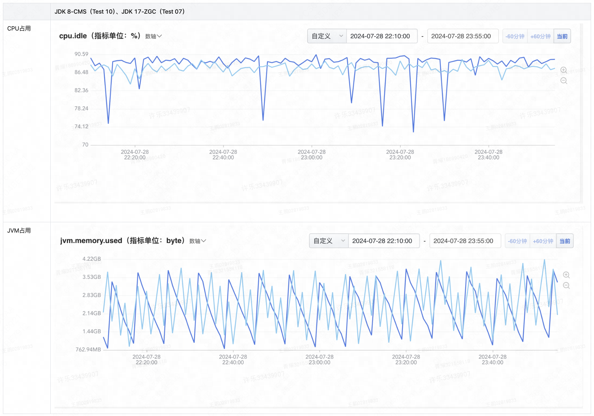 服务升级采用的是Tomcat 9+JDK 17的配置,录制线上流量进行压测,使用同样的流量对先前采用CMS垃圾回收的以及采用ZGC垃圾回收方式的同时进行压测。服务器配置均为8C16G,800QPS的压测,通过2h左右的压测,