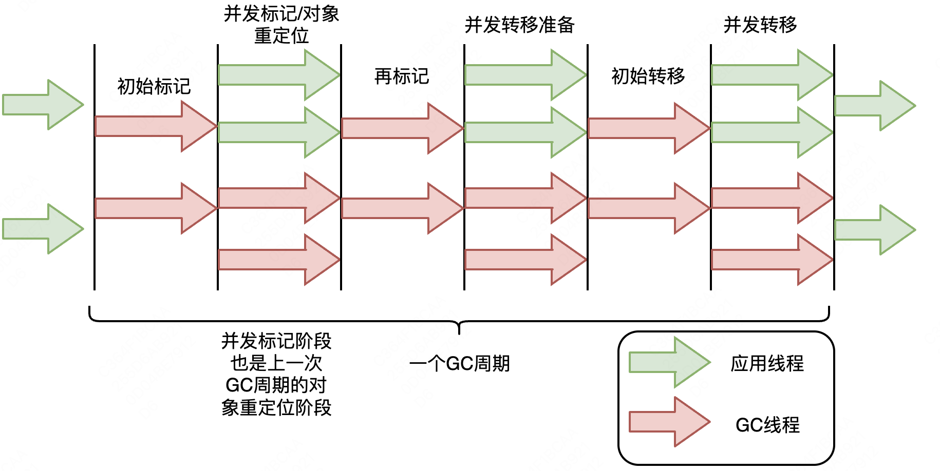 与CMS中的ParNew和G1类似,ZGC也采用标记-复制算法,不过ZGC对该算法做了重大改进:ZGC在标记、转移和重定位阶段几乎都是并发的,这是ZGC实现停顿时间小于10ms目标的最关键原因。