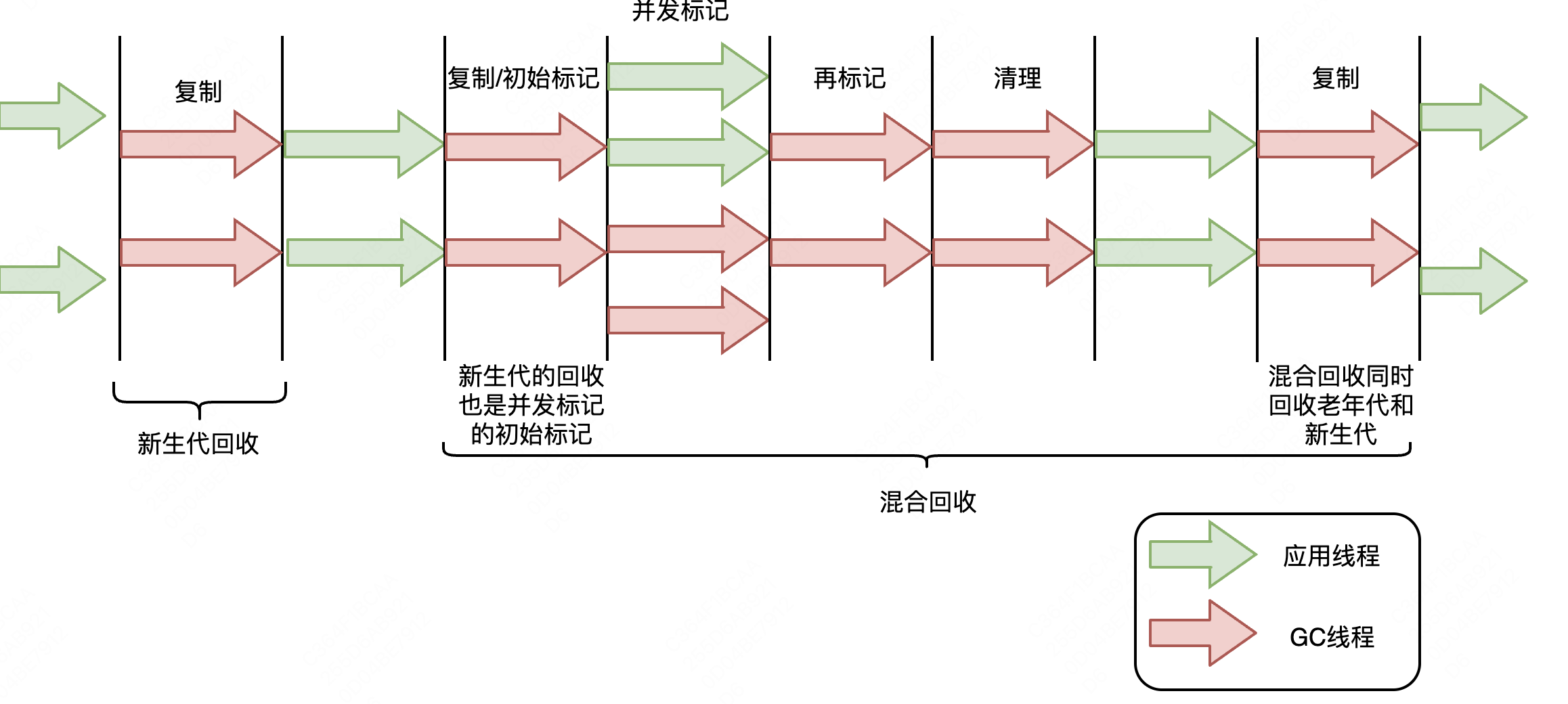 下面以G1为例,通过G1中标记-复制算法过程(G1的Young GC和Mixed GC均采用该算法),分析G1停顿耗时的主要瓶颈。G1垃圾回收周期如下图所示: