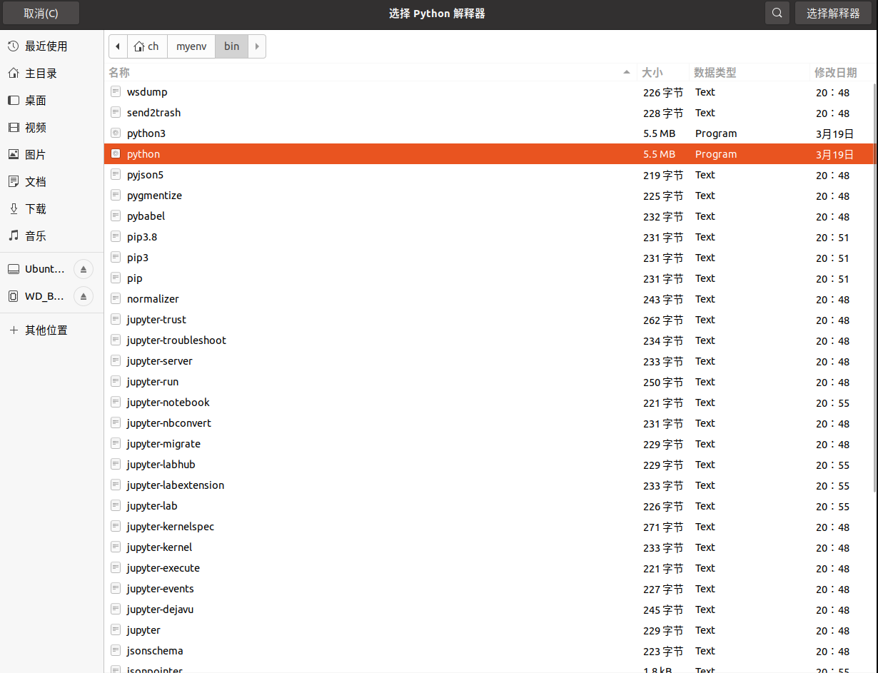 输入解释器路径-查找,博主安装路径为/home/ch/myenv/bin/python,此处改为自己虚拟环境安装位置。