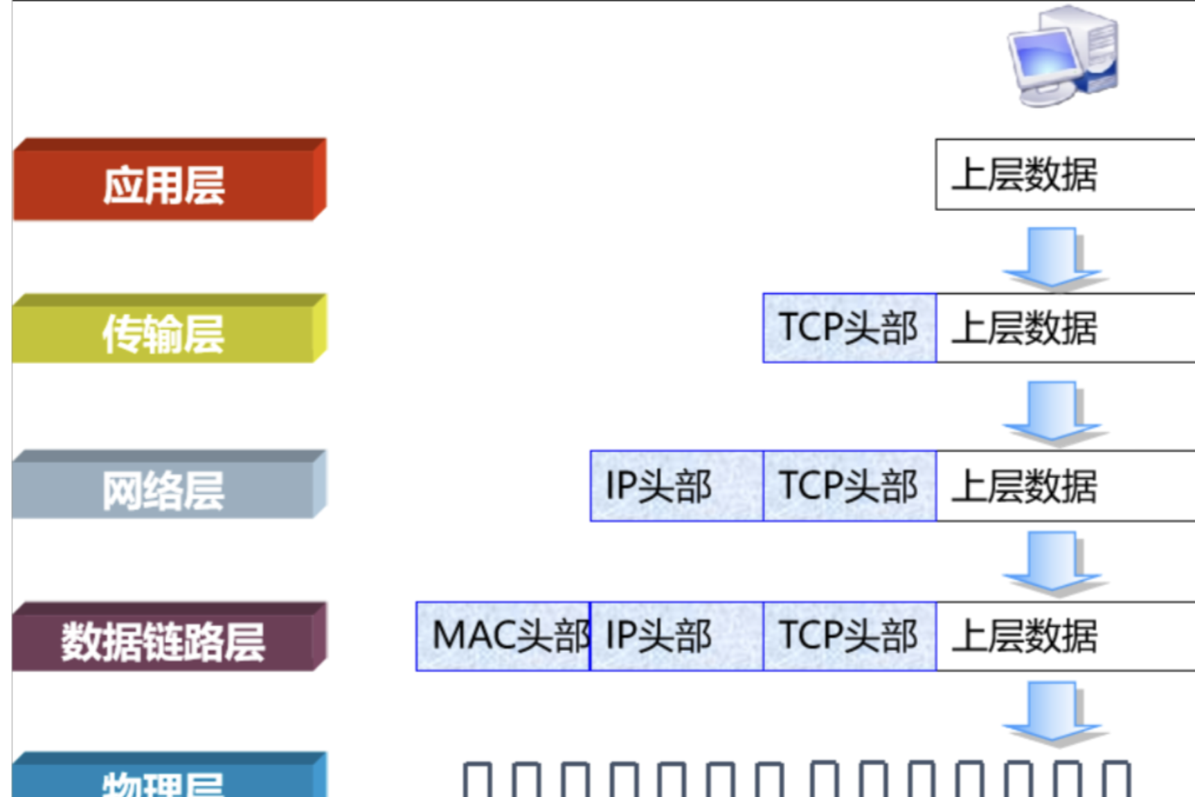 添加应用层首部 添加TCP/UDP首部 添加IP首部 添加MAC首部 转换为比特流 应用层数据 应用层PDU 传输层段/报 网络层分组/数据包 数据链路层帧 物理层传输
