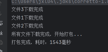 3.两个任务是并行执行的,所以通知先完成(只等了 500ms),外卖查询后完成(等了 1000ms)。