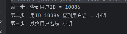 System.out.println("第二步:用ID " + userId + " 查到用户名 = 小明");