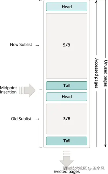 当需要为缓冲池添加新页面腾出空间时,会将最近最少使用的页面逐出,并将新页面插入到列表的中间位置。这种中间插入策略将列表视为两个子列表: