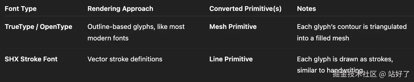 正文使用 TrueType(如 Arial)→ 存入 Mesh Batch- 工程符号使用 SHX(如 simplex.shx)→ 存入 Line Batch