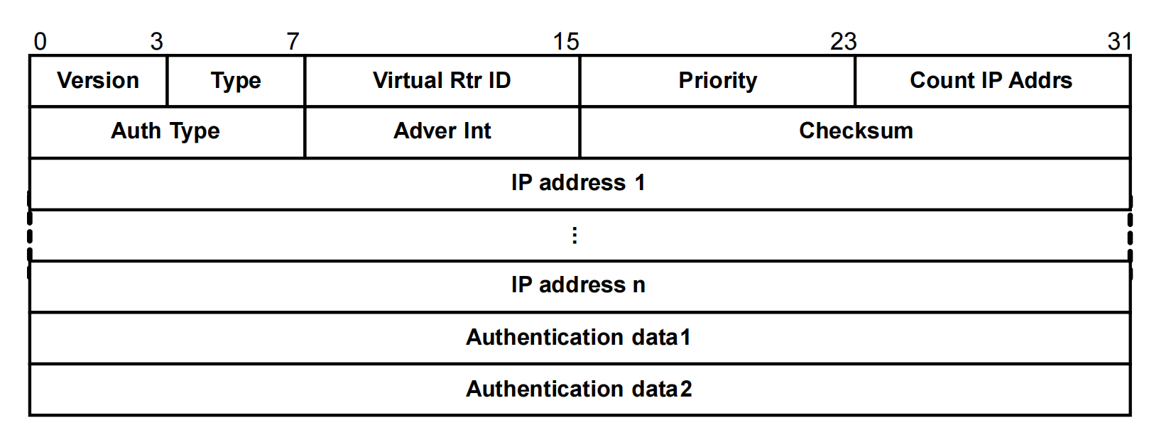 VRRP报文格式:VRRP协议报文是Master路由器以组播的方式,定时发送的VRRP报文。