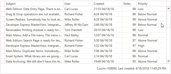 - 当GridControl显示最后加载的行时,虚拟源获取行的下一部分,将FetchMode设置为Manual来改变此操作。