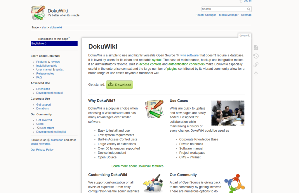 产品简介:DokuWiki 是一款非常流行的、免费且开源的Wiki软件。其最大的特点是不需要数据库,所有数据都以纯文本文件的形式存储,部署和维护极为简单。
