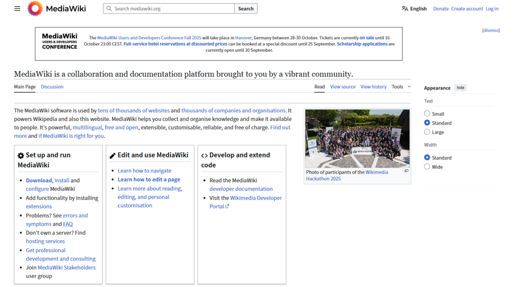 产品简介:MediaWiki 是全球最著名的开源Wiki软件引擎,它正是支撑维基百科(Wikipedia)运行的动力源泉,专为大规模协作和海量内容管理而设计。
