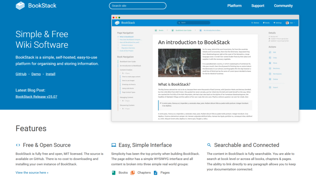 核心功能:采用书本、章节、页面的内容组织形式;内置强大的Markdown编辑器;支持全局搜索和版本历史记录;提供灵活的权限管理;支持多语言界面。