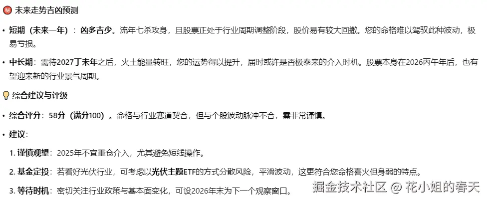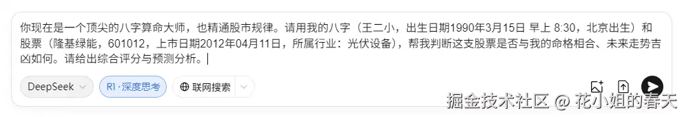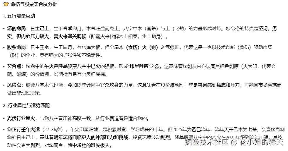 但请记住:玄学不是放弃理性,而是带着敬畏、带着假设精神、带着风控思维去做试验。就像我这次用自己的八字 + 上市日期,通过 DeepSeek 做小规模预测的一次尝试。它给了我"意外惊喜",但不能作为盲信依据。