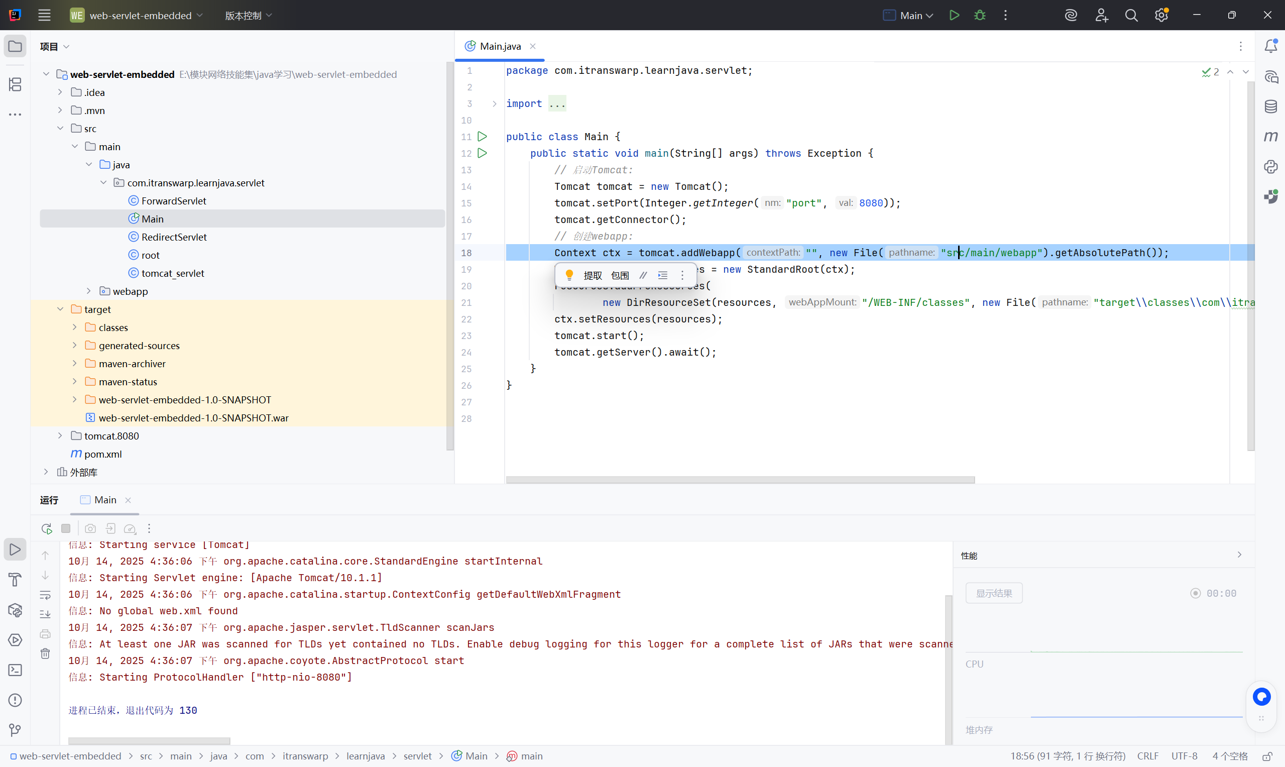 在使用Tomcat 内嵌启动时找不到 Web 应用的路径,如下页面所显示的webapp路径是我们需要去查找的路径,但在运行时出现报错"Caused by: java.lang.IllegalArgumentException: The directory specified by base and internal path [E:\program\java学习\target\classes\com\itranswarp\learnjava\servlet] does not exist."