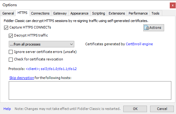 在 Fiddler Classic 打开 HTTPS 解密并允许远程设备连接。