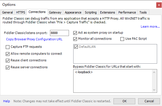打开 Fiddler Classic,进入 Tools > Options > Connections :