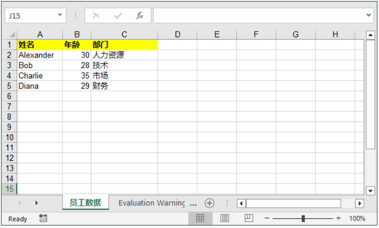 嵌套列表(二维列表)表示含行 / 列结构的表格数据,非常适合直接转换为 Excel 表格。下面我们将一个包含员工数据(姓名、年龄、部门)的嵌套列表导出为 Excel 表格,并优化标题样式。