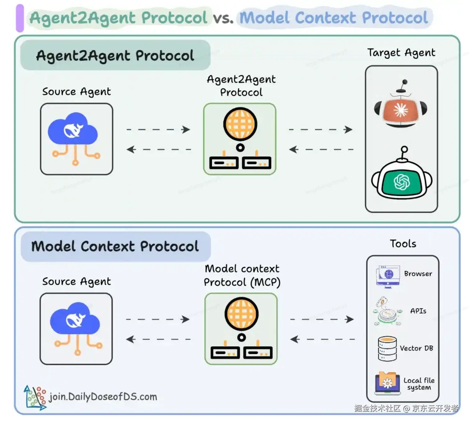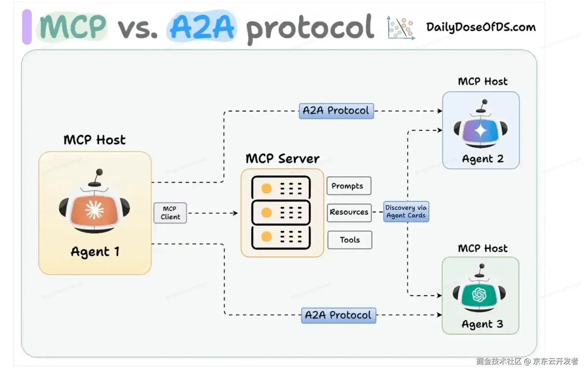 - 而 A2A 允许代理与其他代理连接并以团队形式协作。