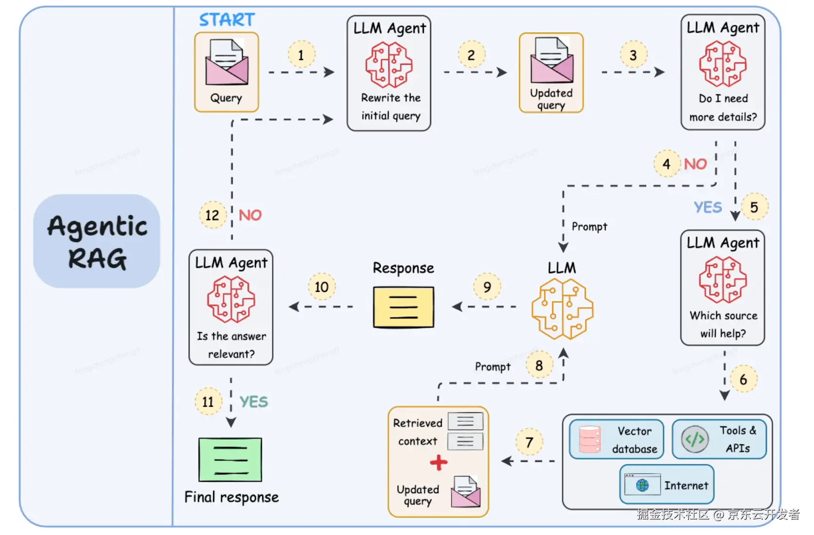 - 步骤 5-8) 如果答案是肯定的,另一个代理会查看其可以访问的相关资源(矢量数据库、工具和 API 以及互联网),并决定哪个资源有用。检索相关上下文并将其作为提示发送给 LLM。