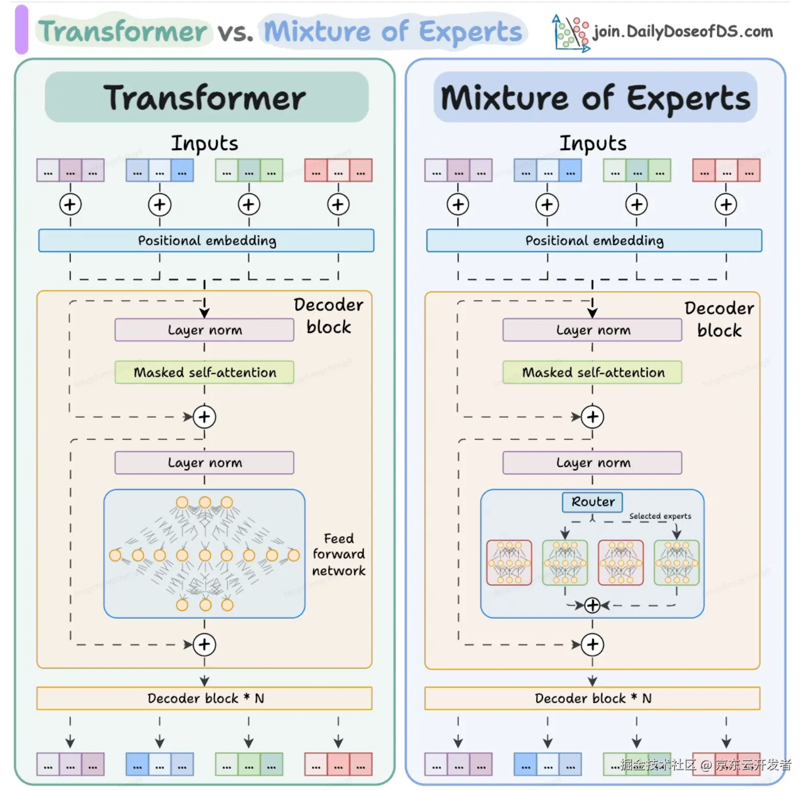 - MoE 使用专家,它们是前馈网络,但与 Transformer 中的网络相比规模较小。在推理过程中,会选择一部分专家。这使得 MoE 中的推理速度更快。