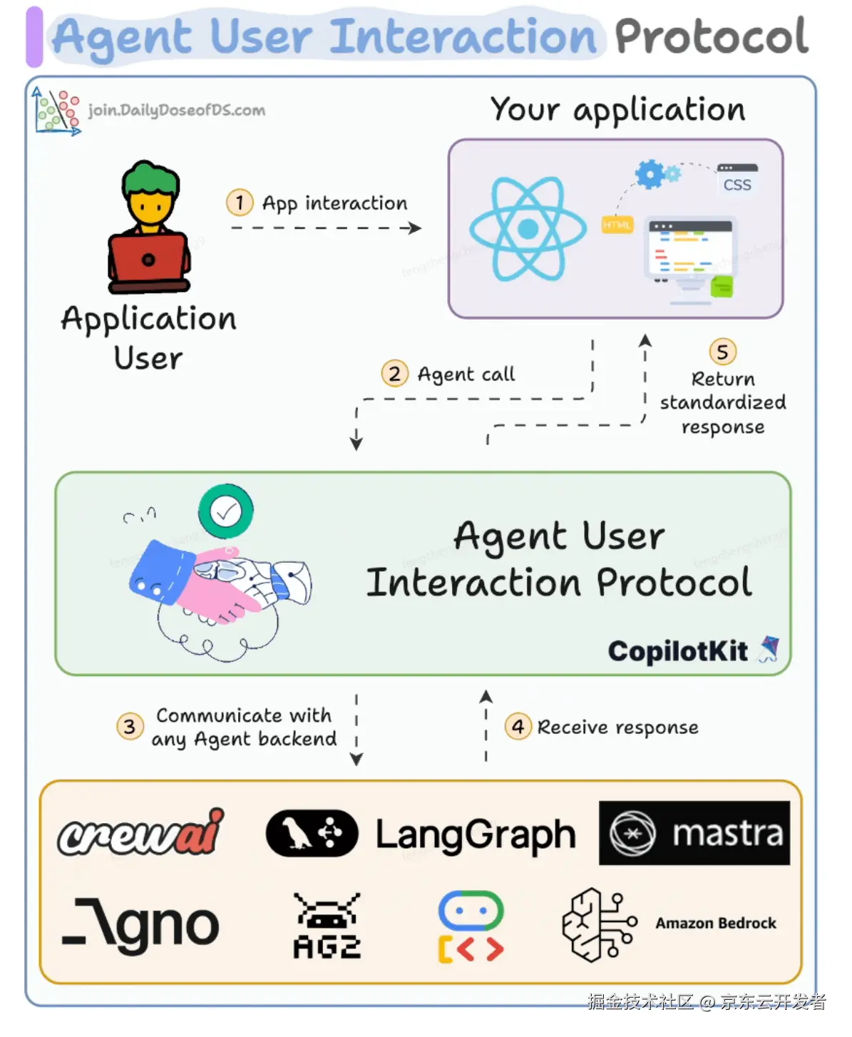 AG-UI(代理-用户交互协议)标准化了后端代理和前端 UI 之间的交互层(下图绿色层)。