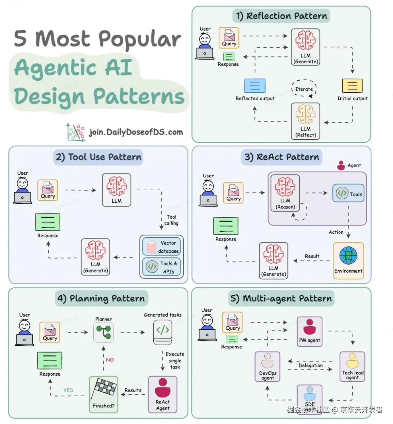 下图展示了构建 AI 代理时采用的 5 种最流行的设计模式。