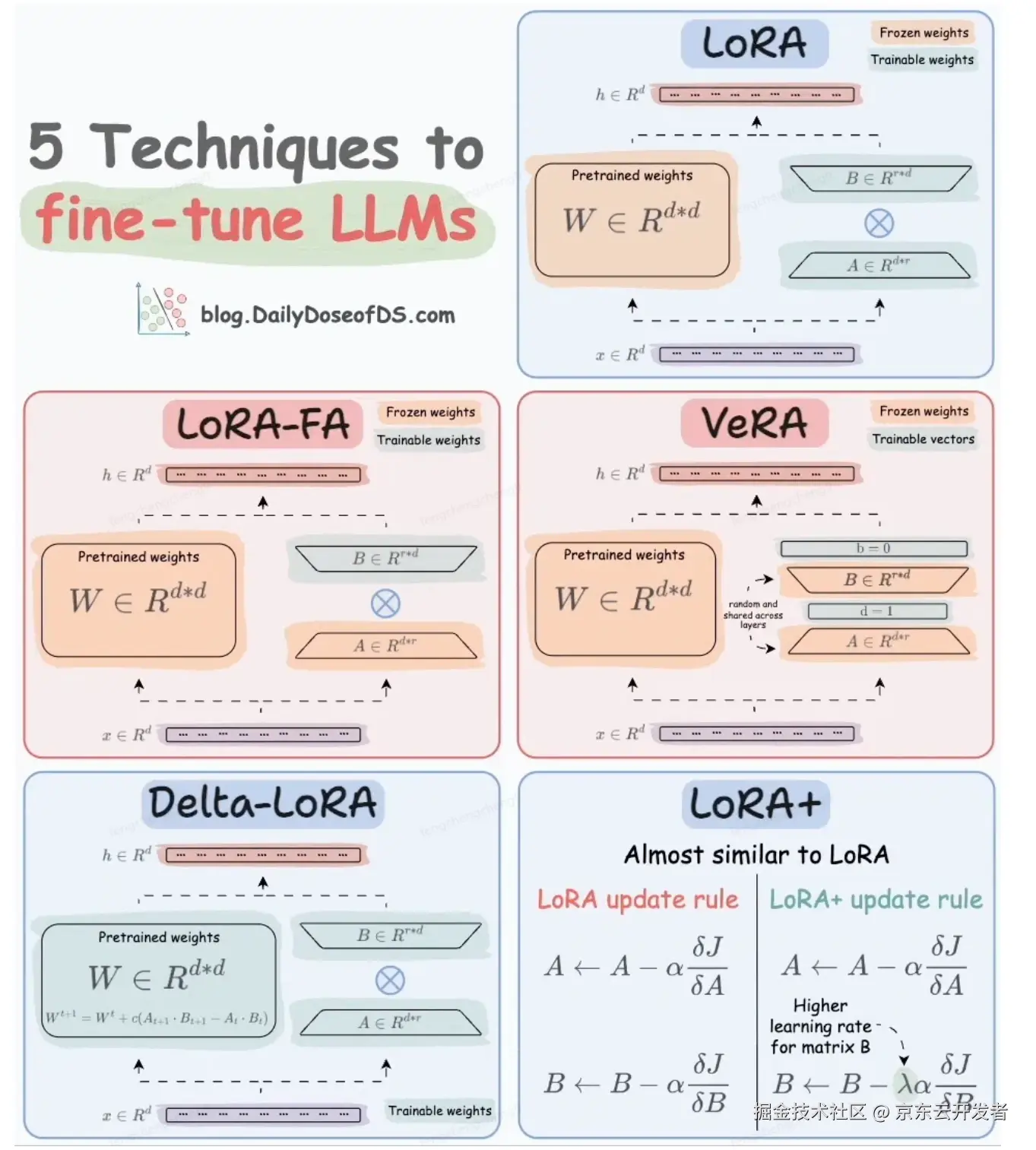 值得庆幸的是,今天我们有许多最佳方法来微调 LLM,下面描述了五种流行的技术: