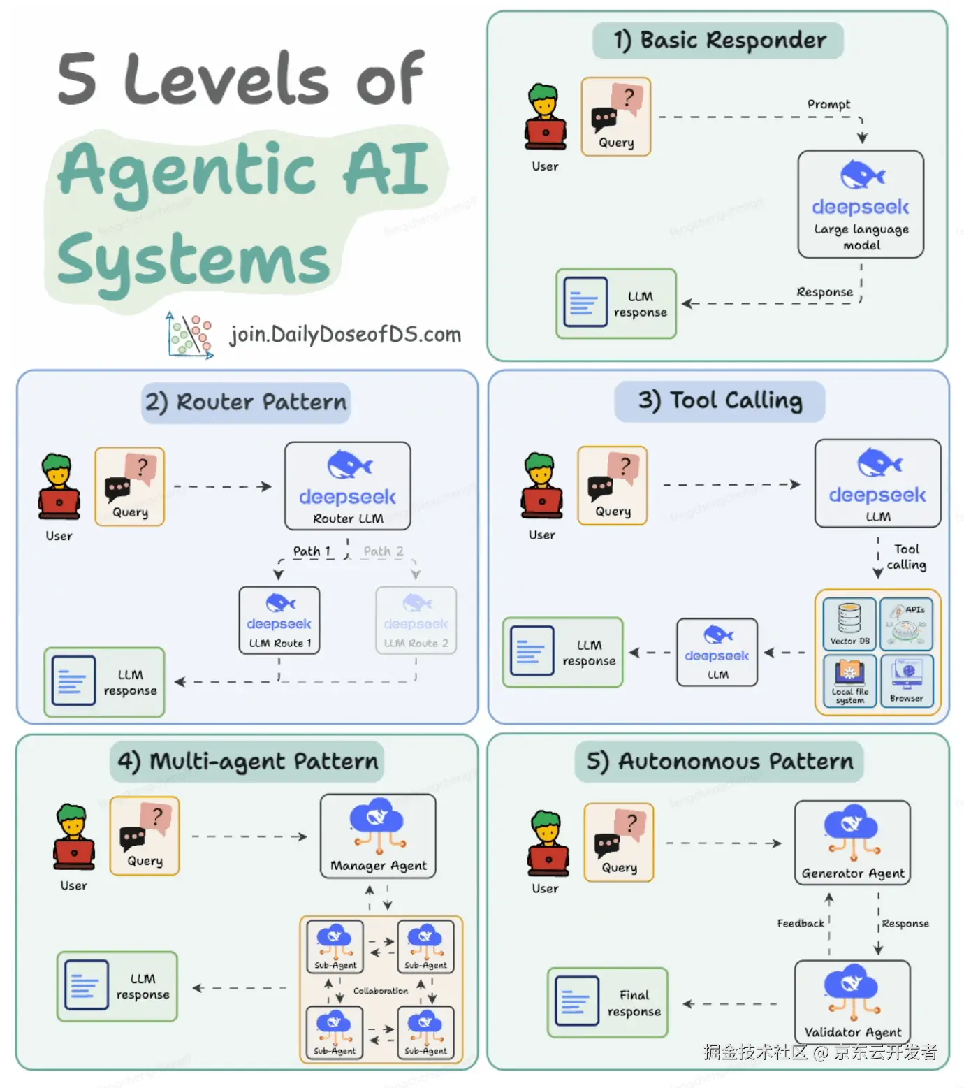 该图解释了人工智能代理的 5 个级别------从简单的响应者到完全自主的代理。