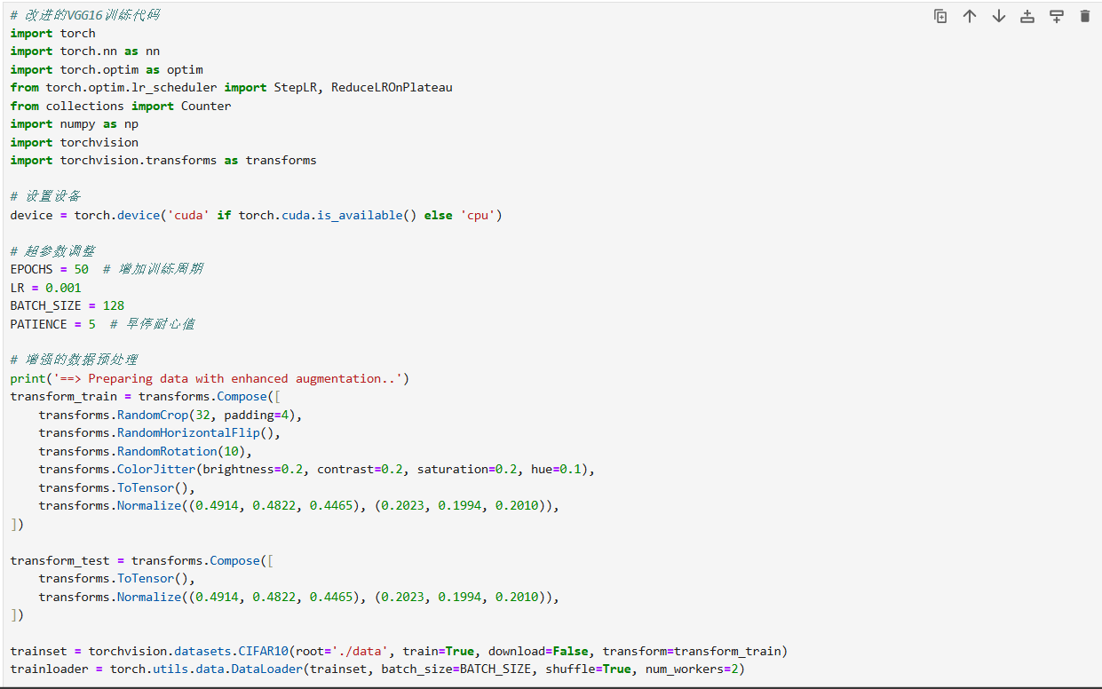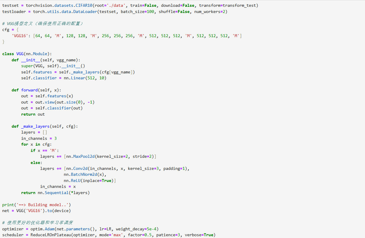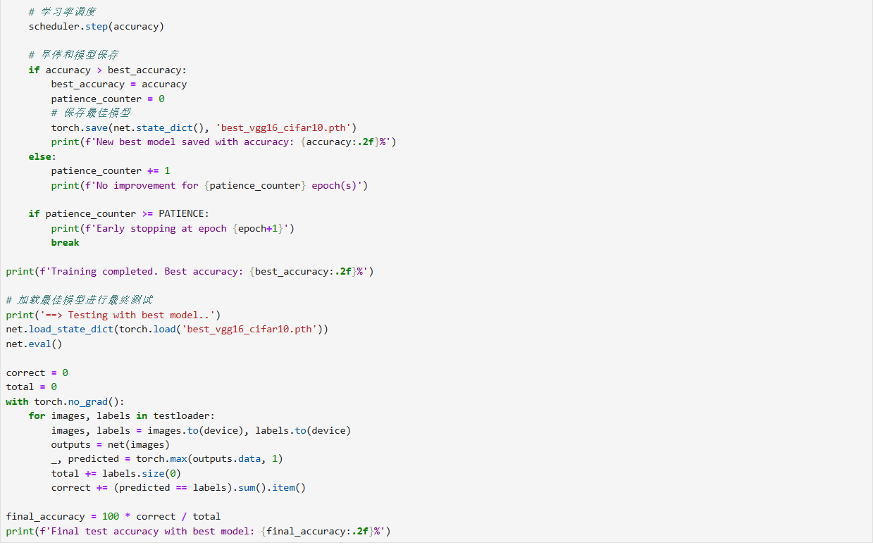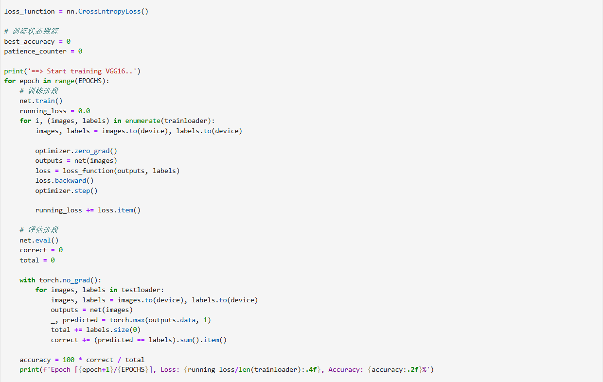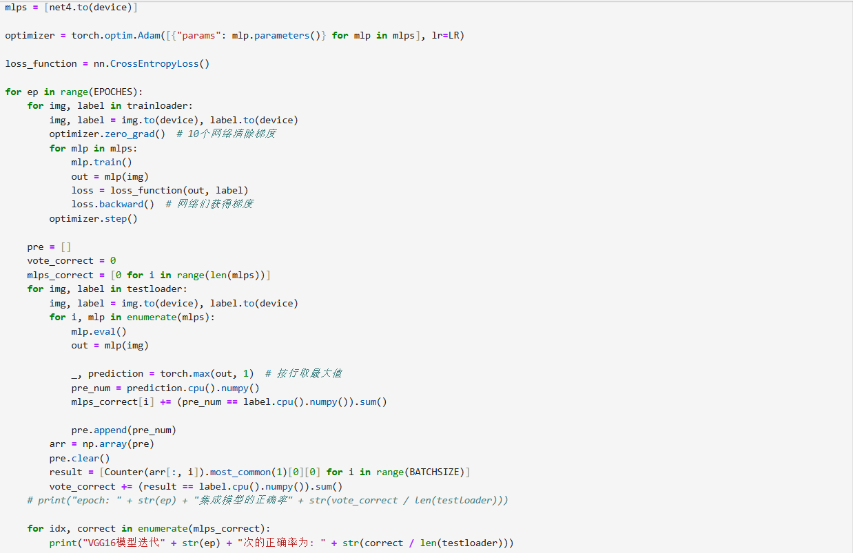 损失函数。训练时,每个模型独立前向传播、计算损失并反向传播更新参数;测试时,各模型输出预测结果,通过 "多数表决" 得到集成模型的预测,最终对比集成模型与单模型的准确率。 - 单模型(VGG16)训练 :单独训练