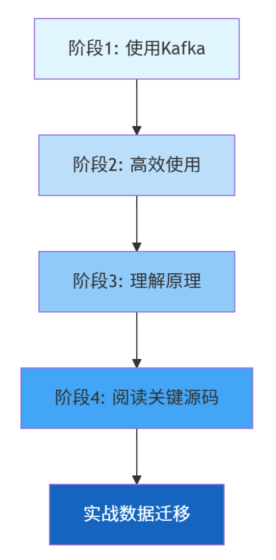 我现在算是处于第一阶段吧,会写对应的kafka的接口,但是谈不上高效使用。调整目标先做到2、3这两点,以及第四点中的部分关键源码(下面这个阶段是我自己定义的,找AI补充的)