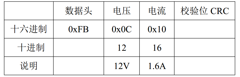 如上图: 0xFB 为数据头, 0x0C 为电压 12V, 0x10 为电流 1.6A