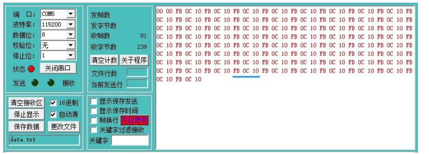 UART 串口波特率 115200, 发送的是 8 位十六进制数据。