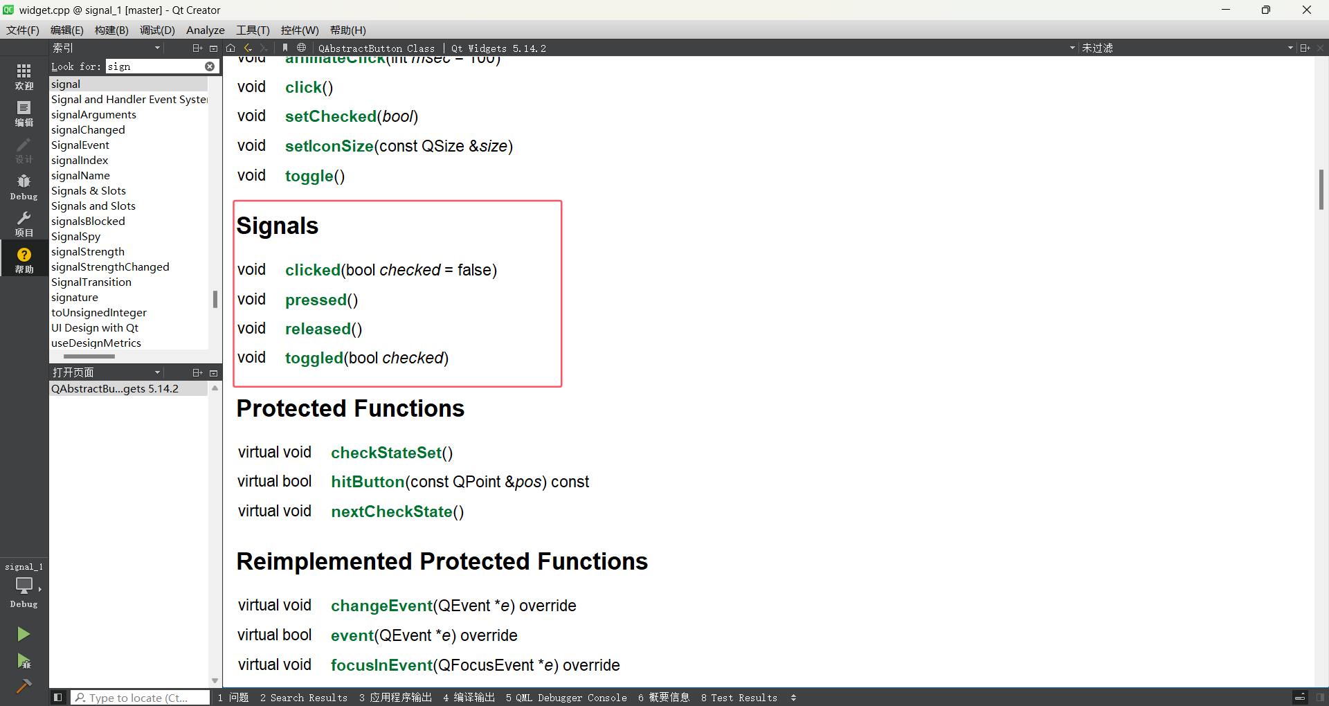 " 来查询。如上述示例,要查询 "按钮" 的信号,在帮助文档中输入: