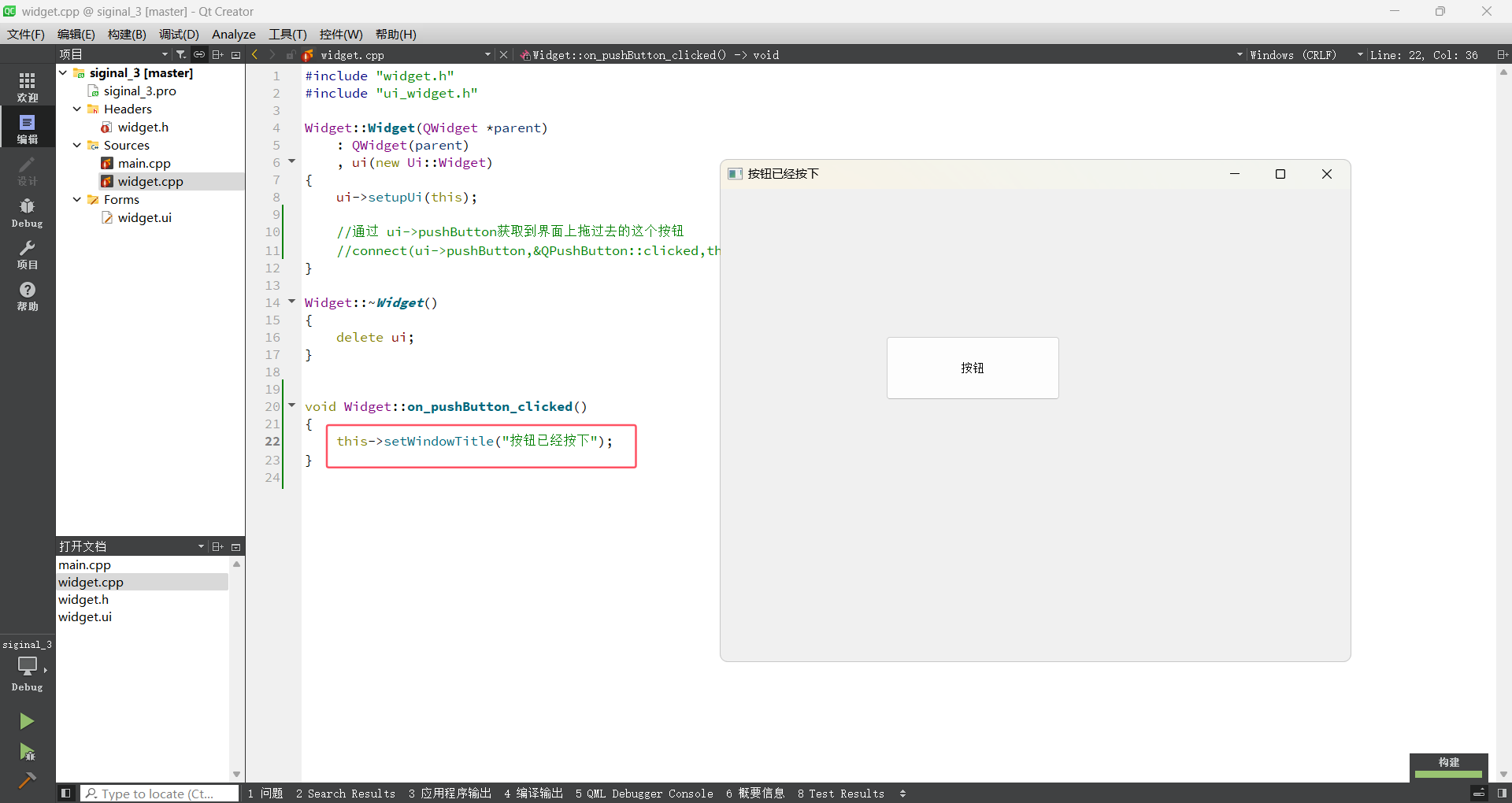 this->setWindowTitle("按钮已经按下");