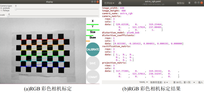 相机标定: 通过张正友标定法,建立相机所拍摄的图像像素坐标系与真实世界三维坐标系之间的精确转换关系,利用棋盘格平面上的点在不同姿态下的投影关系,通过最小二乘法求解相机的内外参数(ROS 中 camera-calibration 功能包)