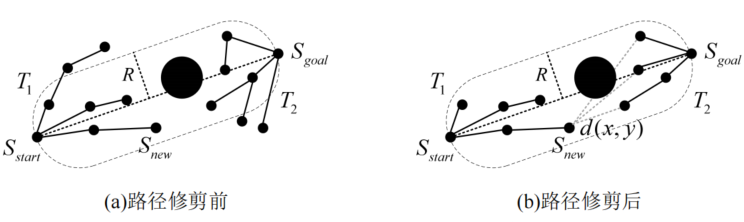 -节点重布线删减冗余节点: 基于最新节点,优化当前最新路径,使得路径具有渐近最优性,在每次采样过程中保持最优节点的选取。
