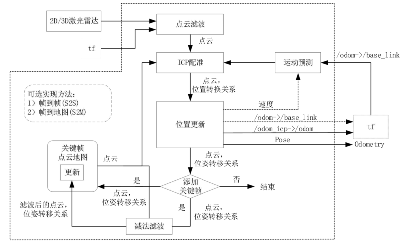 全局地图构建:优化完成后,根据节点中的相关里程计位姿信息,将生成的多个局部地图逐步连接起来组成完整的环境地图,根据需求选择不同的地图拼接方法生成地图类型