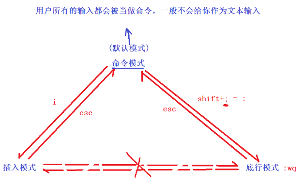 vim有好多模式,我们主要学习3种,分别是命令模式,插入模式,底行模式