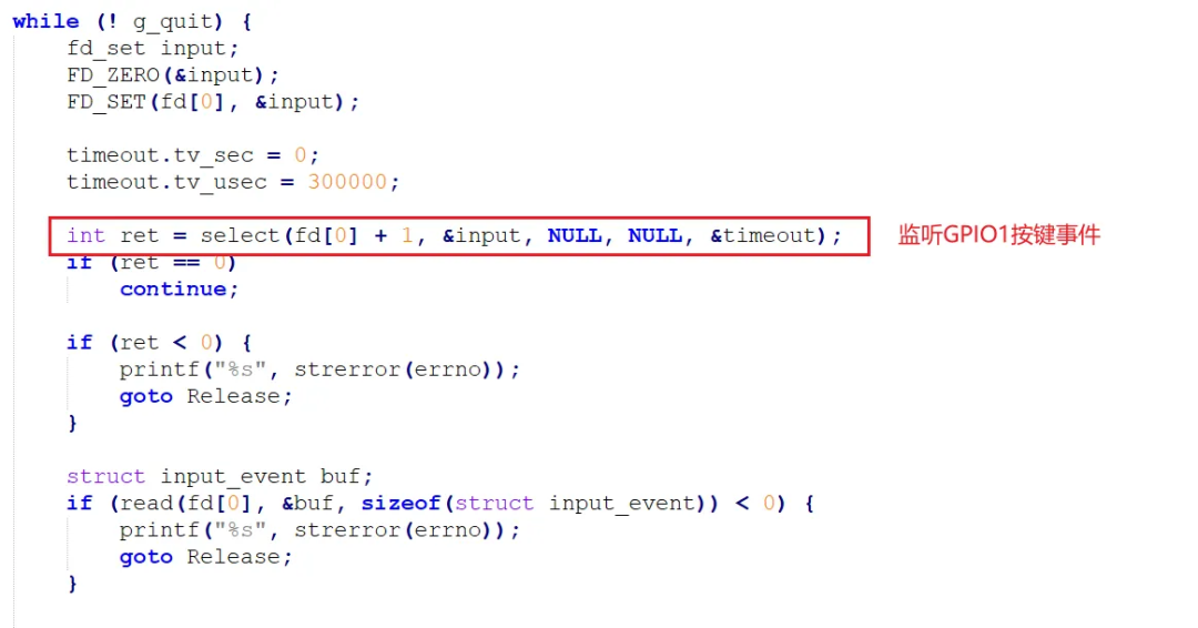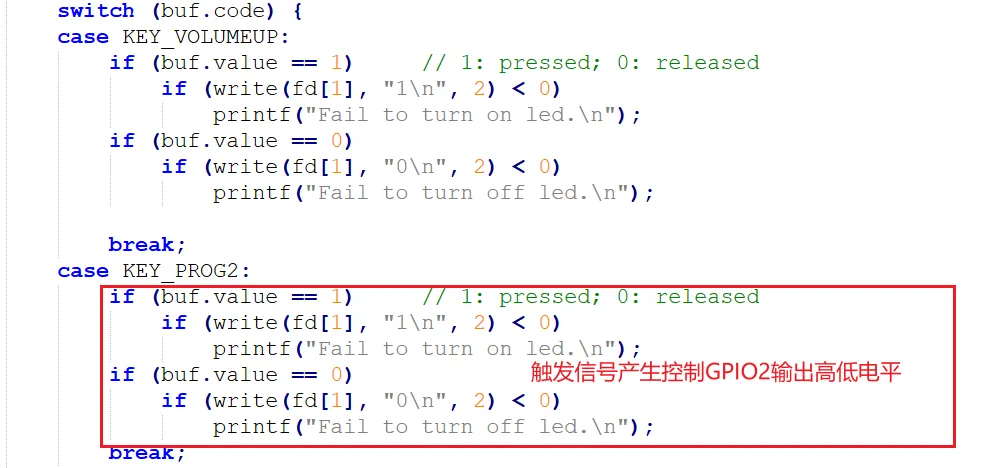 例程通过创建一个基本的实时线程,在线程内实现打开GPIO1对应的按键input设备并对按键事件进行监听从而触发GPIO2对应的LED的亮灭控制。例程代码参考如下: