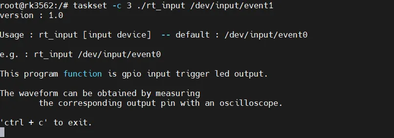 完成交叉编译应用程序后,执行测试程序等待接收触发信号,硬件使用示波器捕获触发信号。