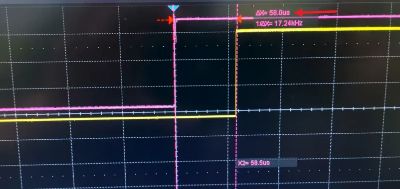 GPIO1使用杜邦线接入3.3V模拟中断触发信号,示波器测试中断延迟为:58us。
