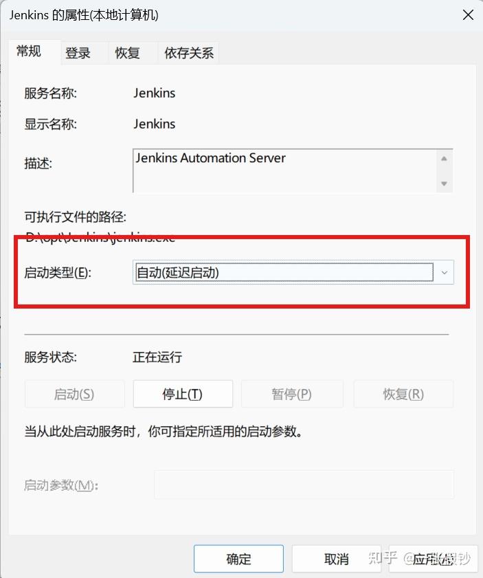 通过按 Win + R,然后输入 services.msc 并按回车来打开服务管理工具。找到 Jenkins 服务,点击右键,查看"属性",Jenkins 默认设置如下: