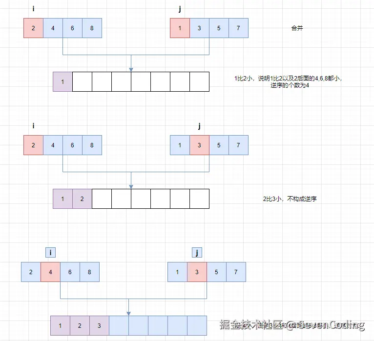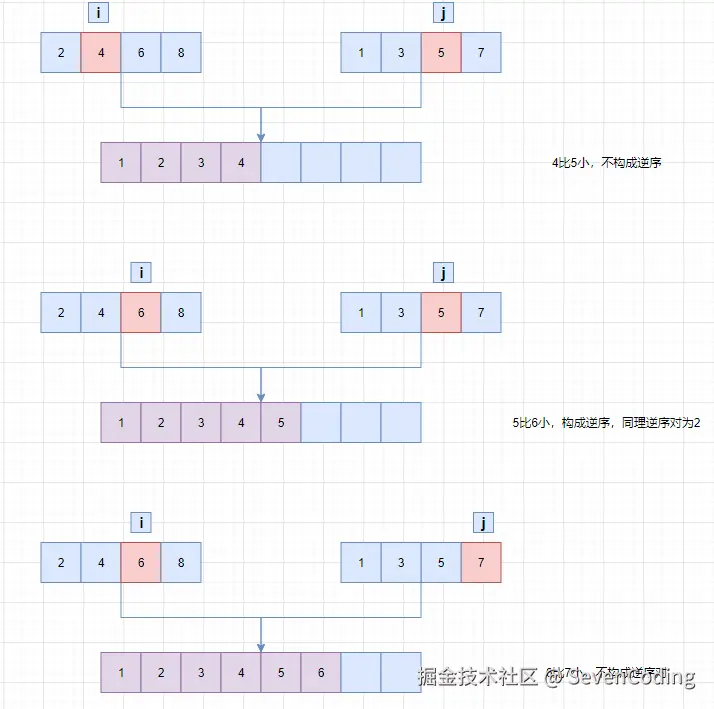 核心原理: 当左子数组的当前元素 temp[i]大于右子数组的当前元素 temp[j]时,左子数组中从 i到 mid的所有元素都与 temp[j]构成逆序对,因为左右子数组都是有序的