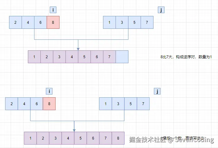 在归并排序的基础上稍微改动即可。以数组[8,6,4,2,7,5,3,1]为例: