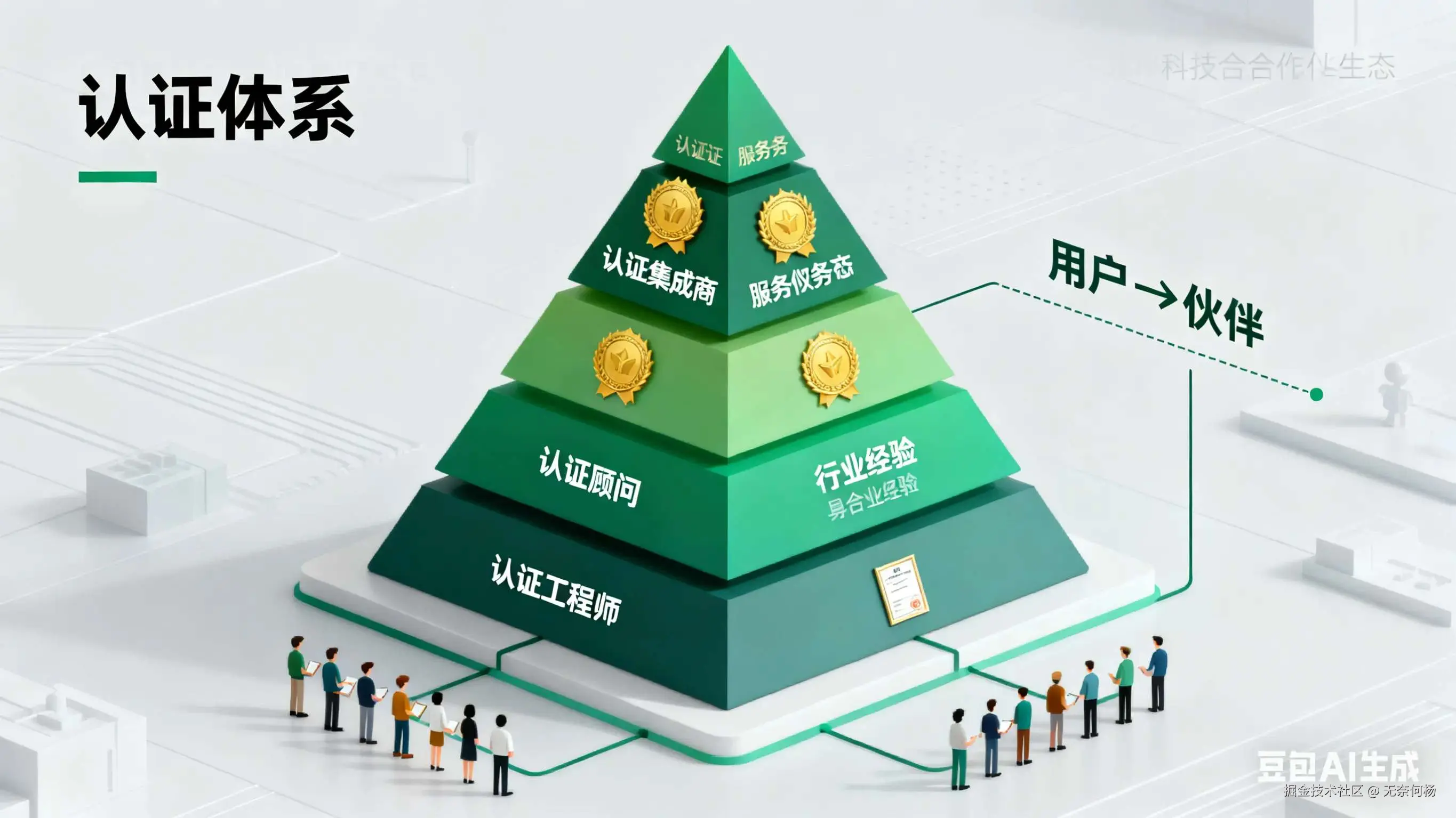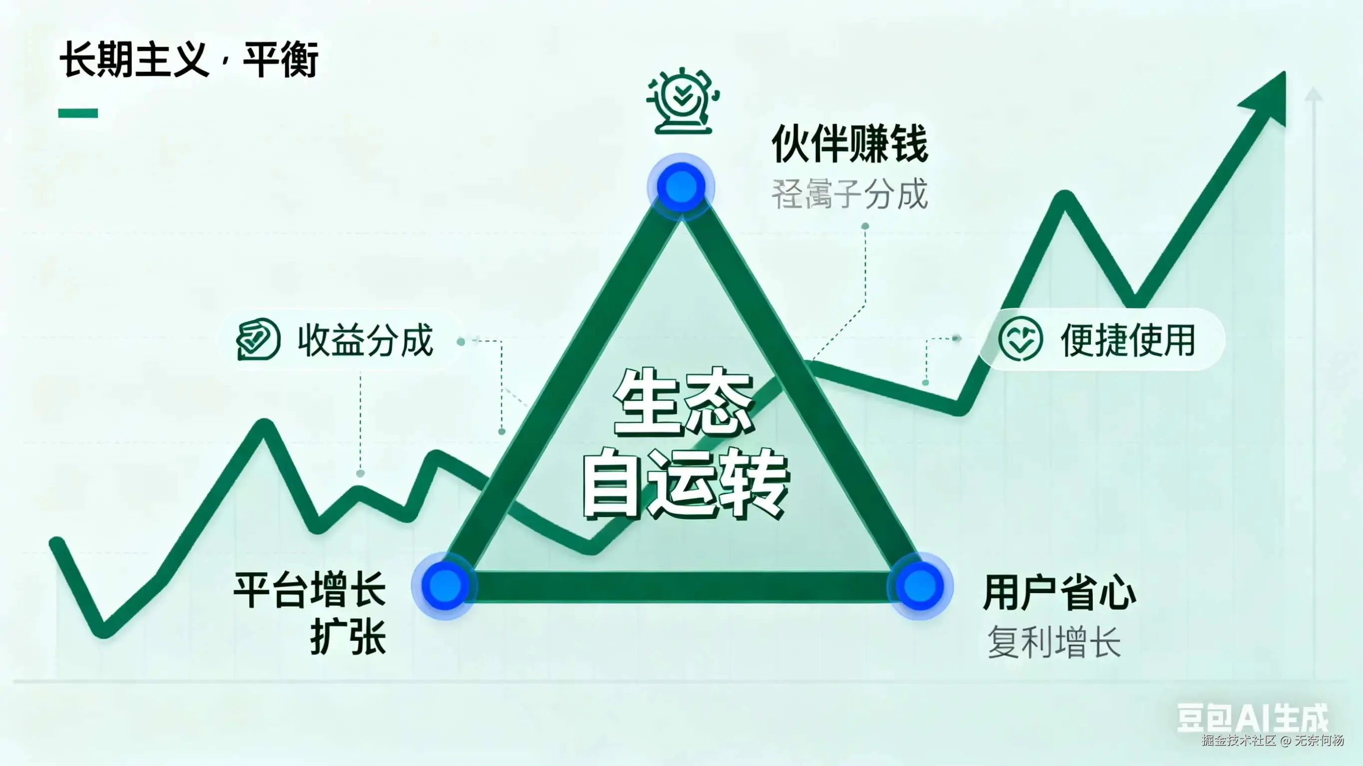 成熟期(3年+) | 建立生态复利 | 认证体系 + 收费生态服务 |