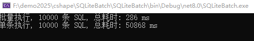 Console.WriteLine($"批量执行, {batchSqls.Count} 条 SQL, 总耗时: {executeStopwatch.ElapsedMilliseconds} ms");
