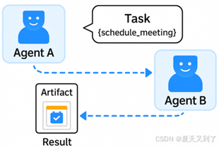 任务具有生命周期,从创建、执行到完成,这个过程中智能体可以交换多条消息进行协调。完成后,结果将被打包为工件返回,作为任务的交付成果。例如,调度任务的工件可能是日历邀请或确认邮件。